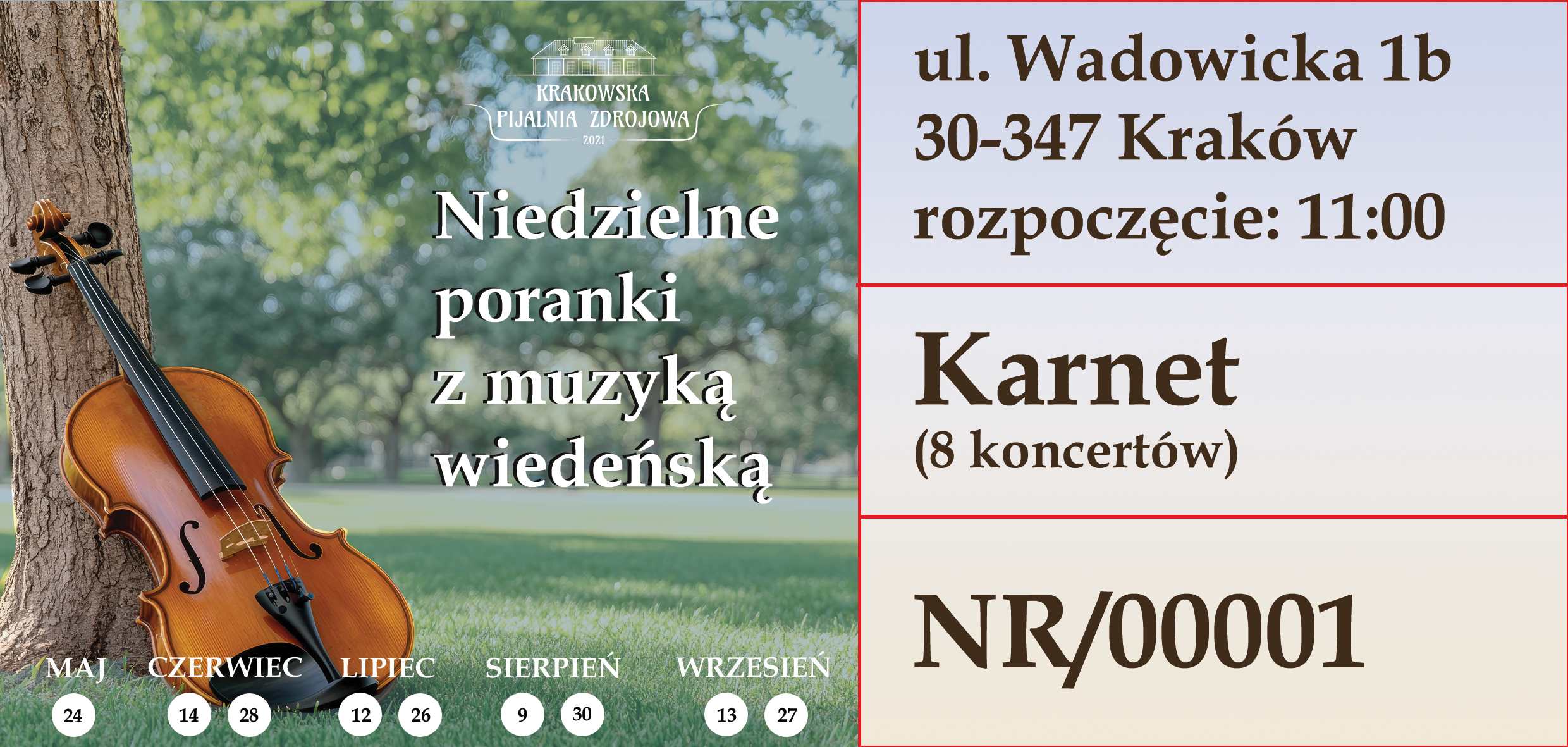 Karnet na wszystkie koncerty z cyklu „Niedzielne poranki z muzyką wiedeńską”. W cenie karnetu oferujemy kubeczek dowolnej wody na każdym koncercie.